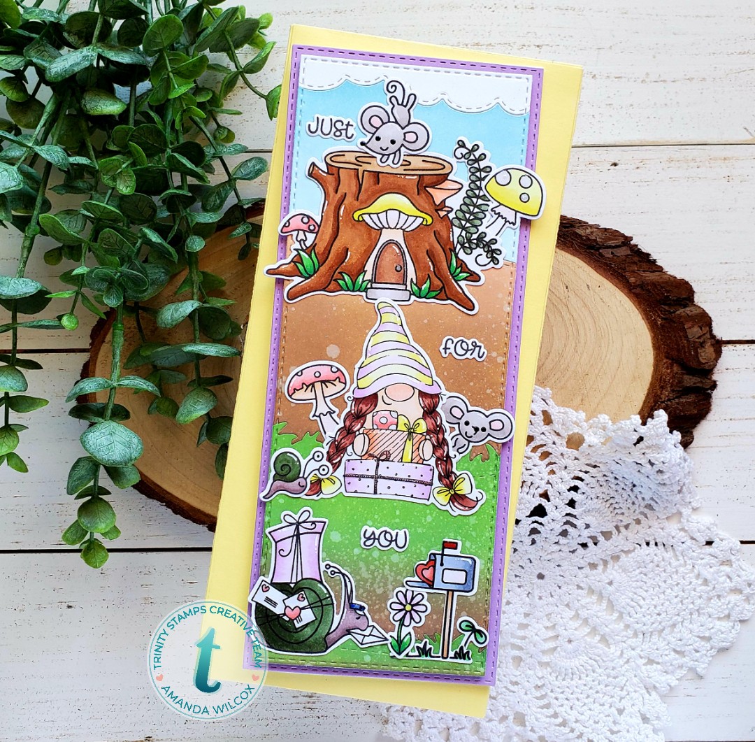 If you’ve followed me for very long, you know I like full cards…and I LOVE THIS ONE! It’s got so many fun things to see. Those playful mice and that sweet gnome bearing gifts, finishing it off with Mr. Snailman delivering some happy mail! I hope you enjoyed today’s card and find some inspiration to create something wonderful!