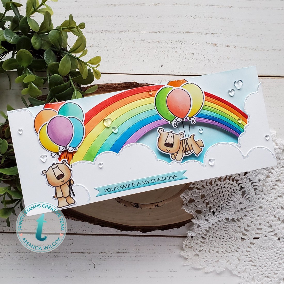 Once the card was put together I also added some Stickles to the cloud edges and those awesome boiled sugar jelly drop hearts. Oh, and you know I had to add some shimmer to the rainbow with my Wink of Stella glitter brush pen. Here’s a closer look.