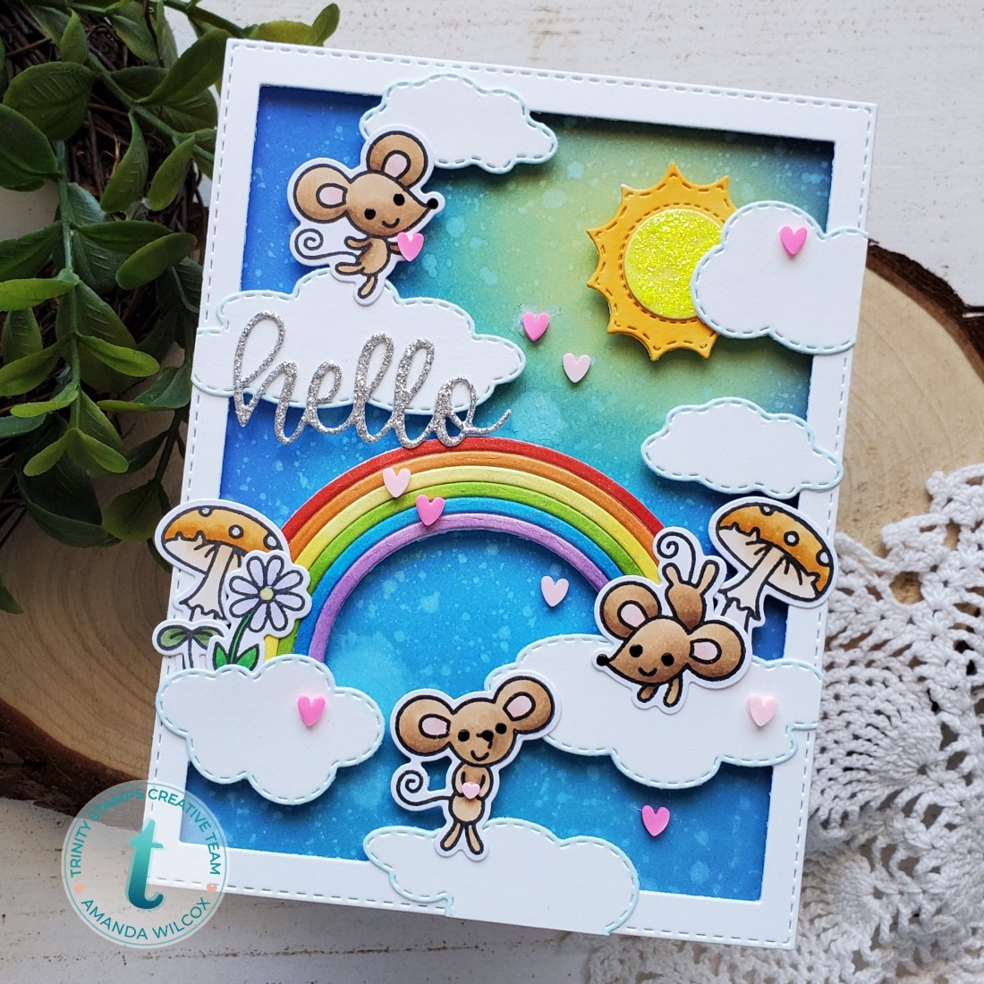 I laid everything out to get a general idea where I wanted my stenciling. Once I figured it out, I grabbed my Shine Brighter stencil from Trinity Stamps and added white glitter glitz gel. Once that was dry, I used the Trinity Slimline Scenic Borders die set to create some clouds with iridescent vellum. Last, I popped my images on with a combination of foam tape and liquid glue.