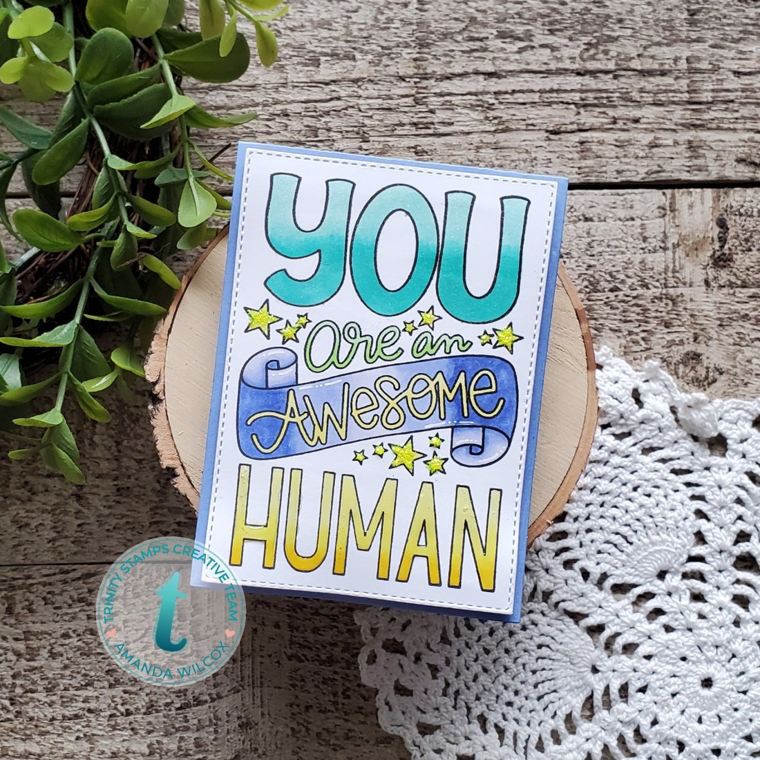 For my background, I was inspired by my friend, Candice Fisher, over at CandiCards. She’s always sharing beautiful inspiration. She used similar colors on a stenciled background last week and I loved it so much I had to try it. I don’t have the same colors she used so I chose distress oxides in abandoned coral, dried marigold and tattered rose. After blending with my Trinity Blending Buddies, I spritzed it with water and trimmed it down so I had a small white border from my cardbase.