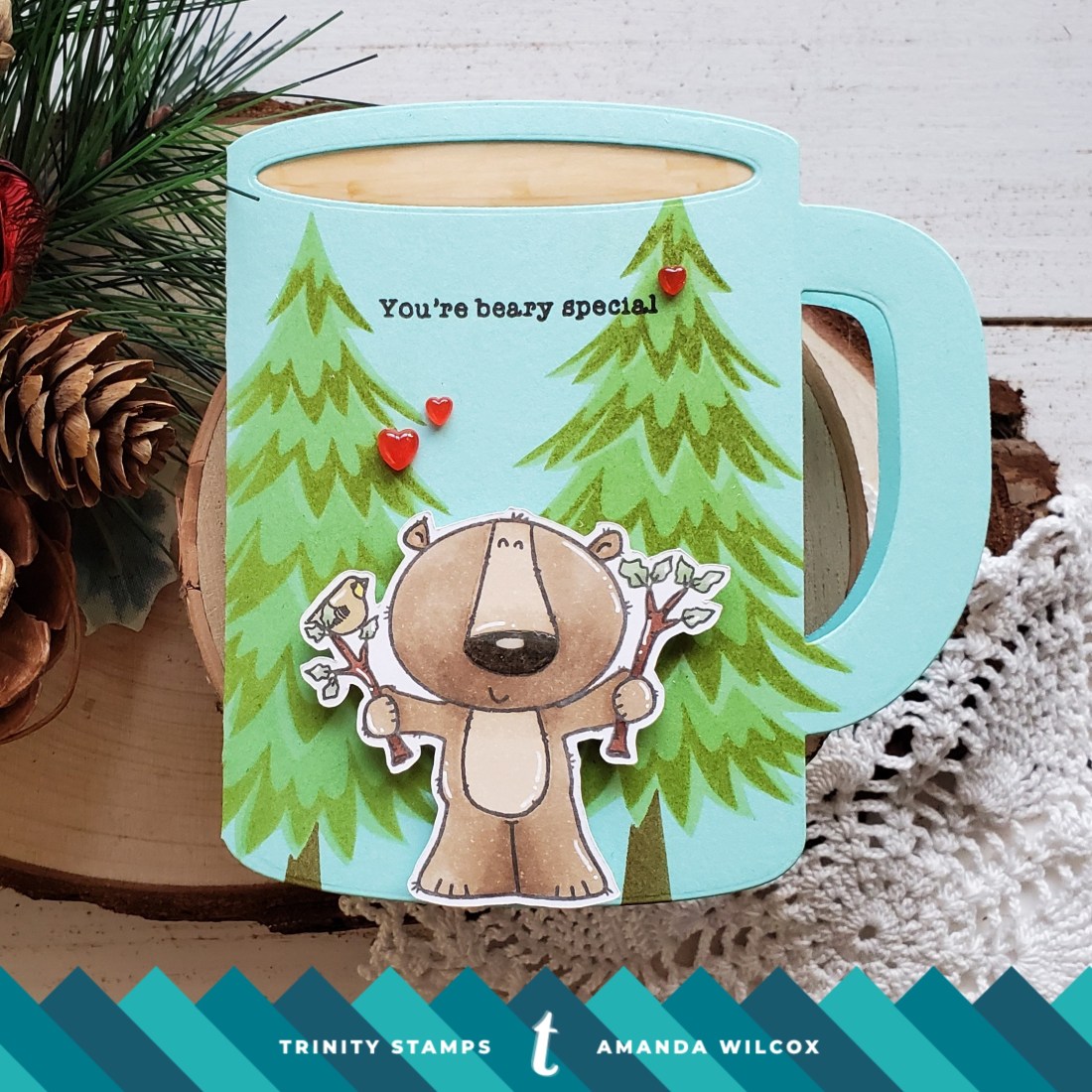Next I popped my polar bear up with foam squares, heat embossed my sentiment, cut it into a thin strip and popped it up as well. For finishing touches on this cute card I added Wink of Stella glitter brush to the mittens and scarf, and glossy accents to the skates, boot cuffs, mitten cuffs, scarf stripes, bear’s nose and the heart on the mug. Finally, I added a cinnamon red hots jelly drop heart to the end of the sentiment strip.