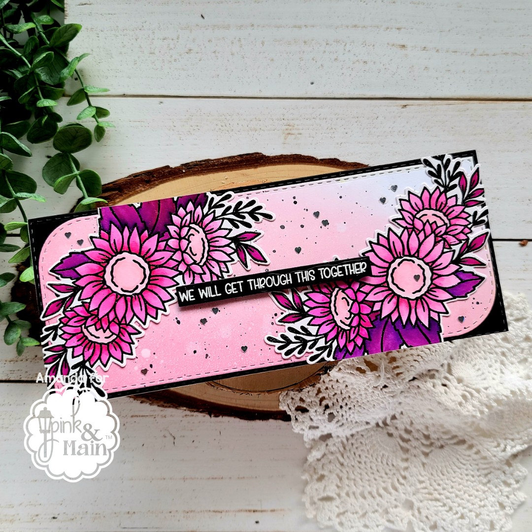 For my card, I stamped and heat embossed images from Sunny Greetings in black. Then I watercolored them with my Zig markers and cut them out with the coordinating dies. I took spun sugar and picked raspberry distress oxide inks and blended them in a panel. I spritzed it with water and flicked black paint on it. Once that was dry, I used the larger of the Beautiful Slim Line dies to cut the panel out. Then I took the largest Stitched Slim Line die and cut a black panel.