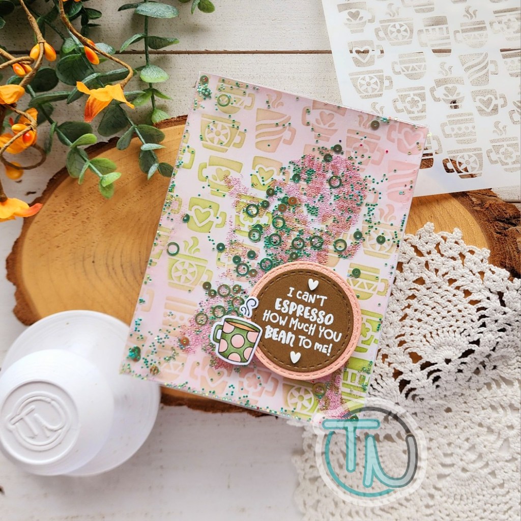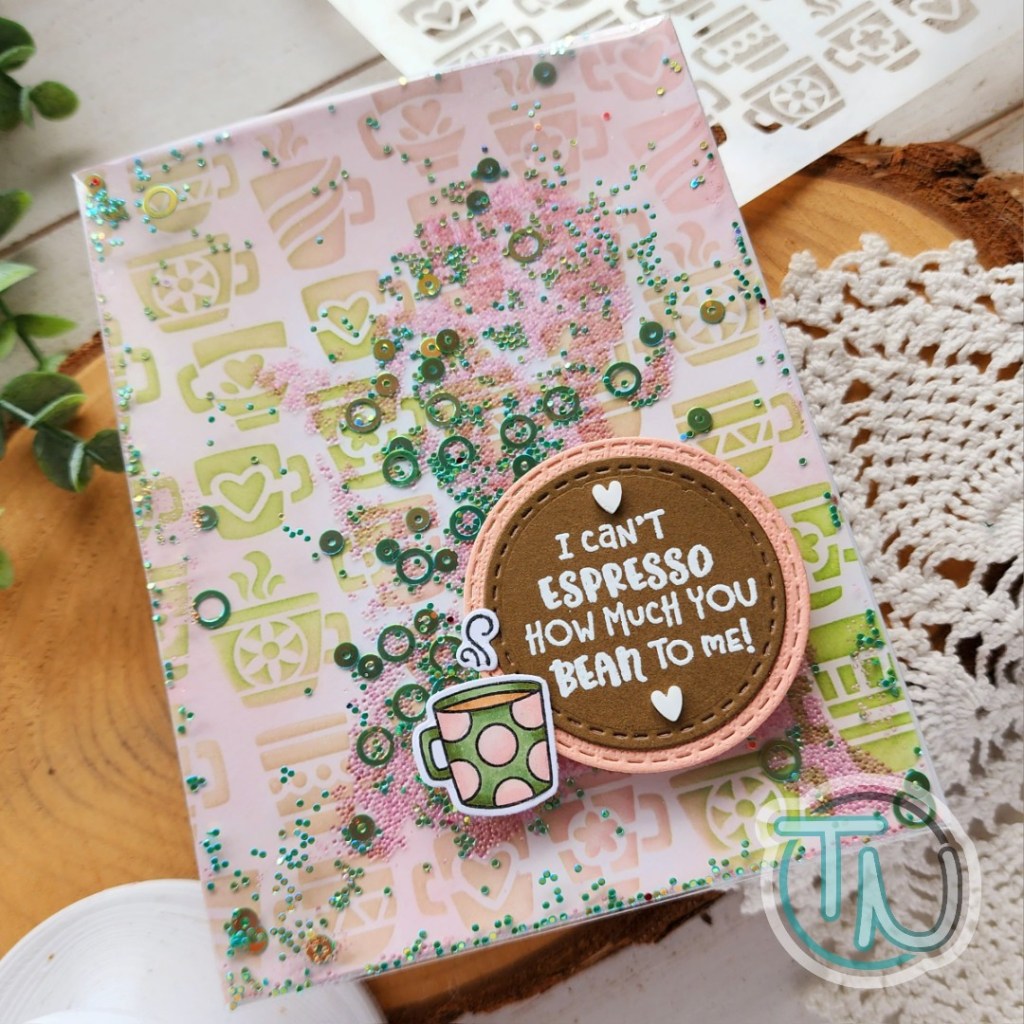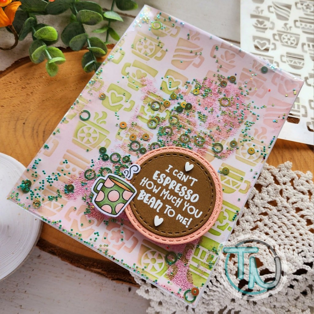 I started by inking up a panel with the Newton’s Nook Mugs stencil. I used green, pink and brown for my color palette today. I trimmed it down a smidge and inserted it into a Tonic Studios full card shaker pocket, leaving one end open to fill up. I chose Pixie Dust Micro Beads and Princess Rings for my shaker bits today. Then sealed the last opening up.