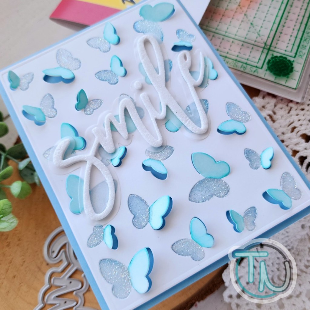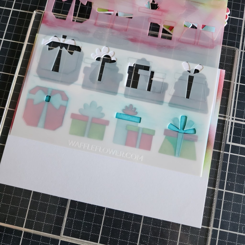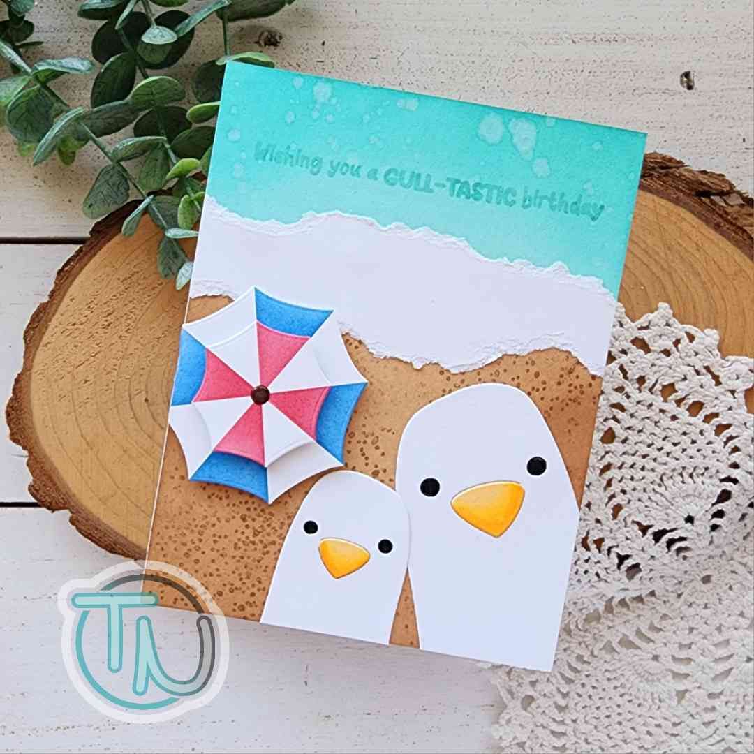 I started this card by just playing with the Waffle Flower Beach Umbrella die and stencil combo and the Inquisitive Seagulls dies. Both of these products are so fun and could be used for lots of types of cards too.